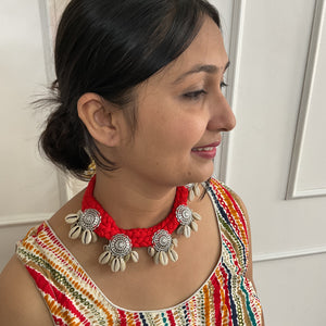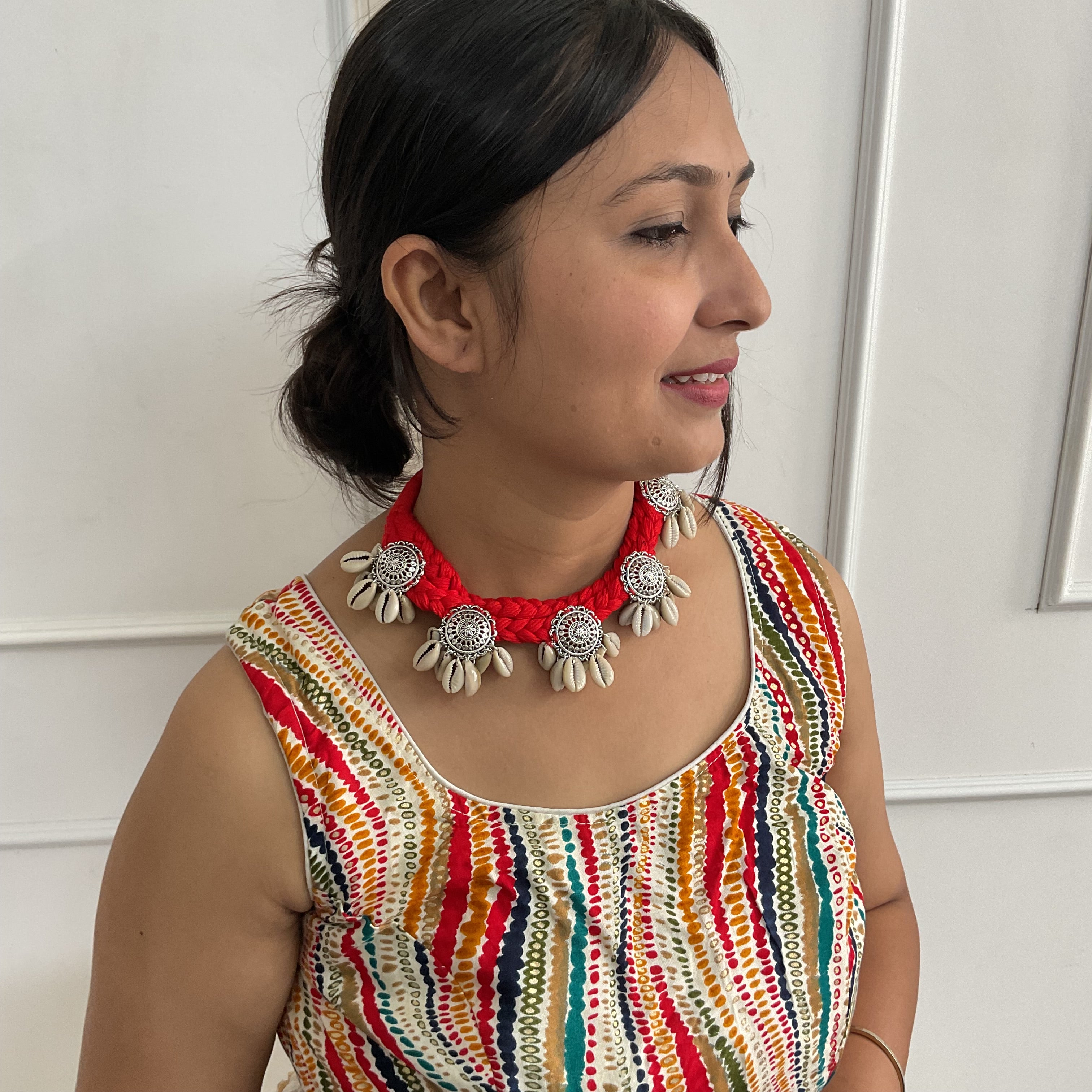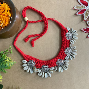 Amoli handmade cotton fabric necklace features Red thread and Oxidised piece with shells hanging, creating a sleek and modern look. Perfect for adding a touch of understated glamour to any outfit.