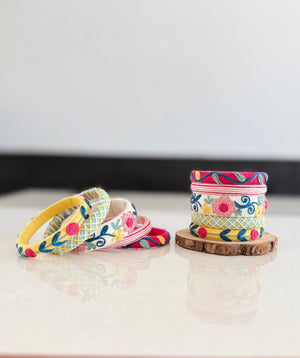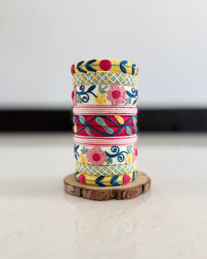 Stylish multi-color embroidered bangles with delicate floral patterns and vibrant threadwork, designed to add a unique touch to your ethnic look.