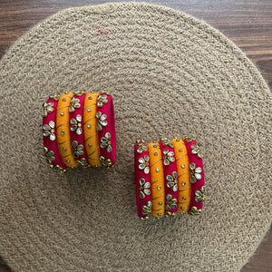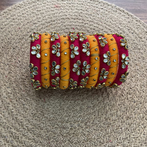 pink and Turmaric Yellow bangels with kundan nd gotapatti work, perfect for a wedding nd other tradition.