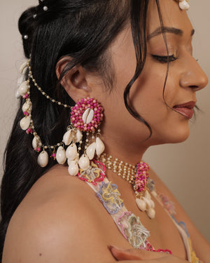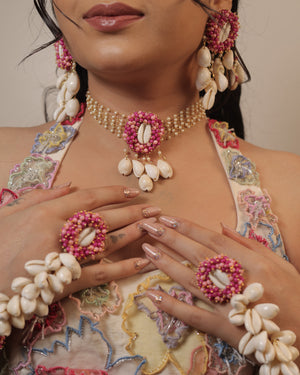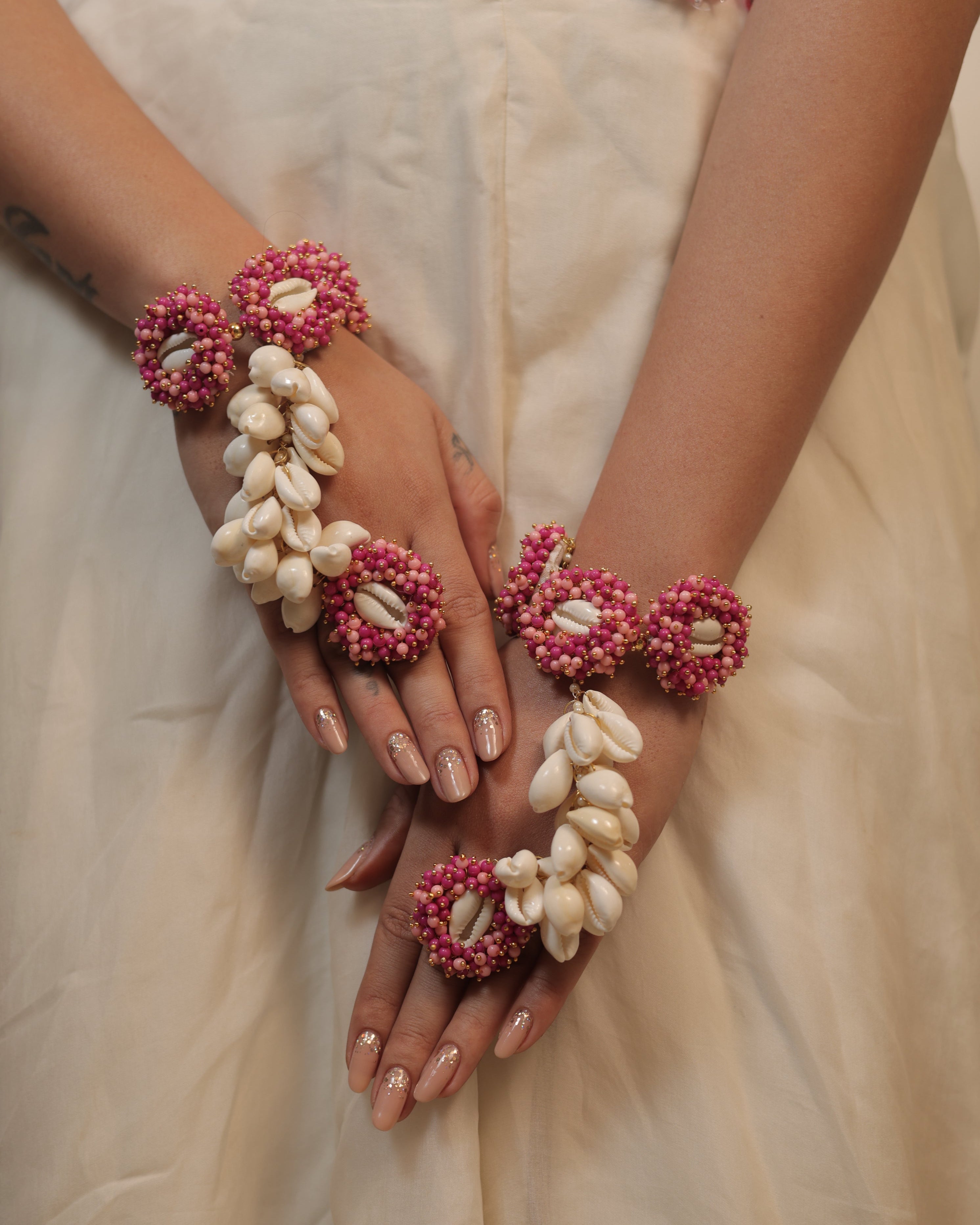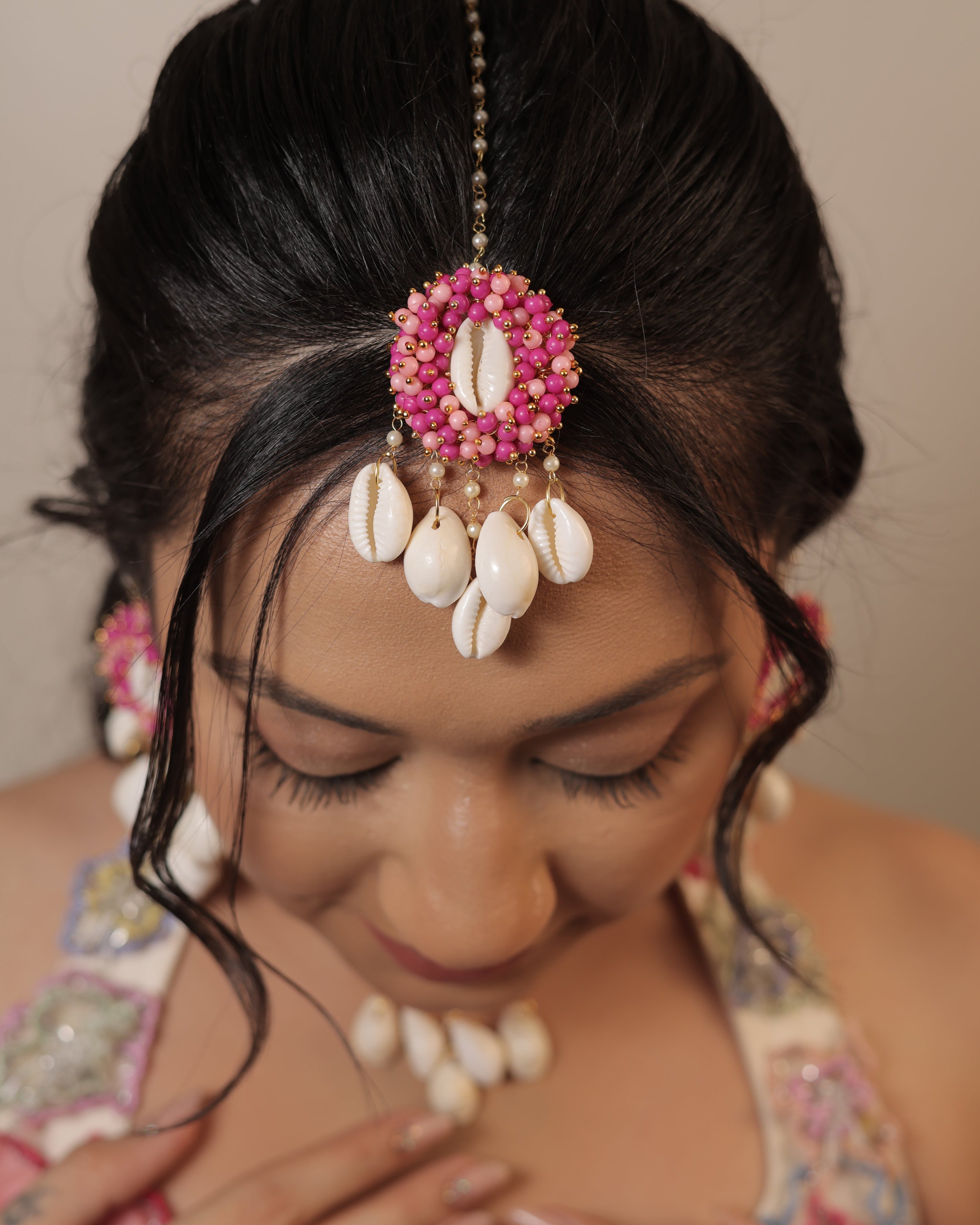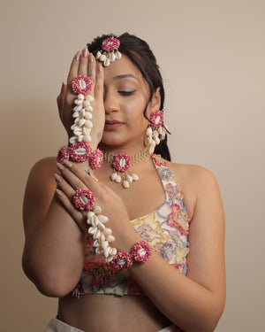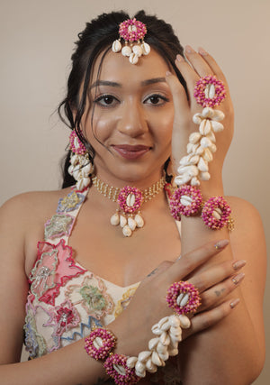 Add a vibrant touch to your Haldi ceremony with our Best Seller Cowrie Shell Haldi Jewelry Set. Handcrafted with beautiful pink beads and natural cowrie shells, this elegant set is designed to give brides a fresh, festive, and traditional look while staying lightweight and comfortable throughout the celebration.