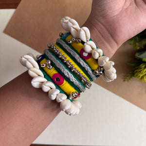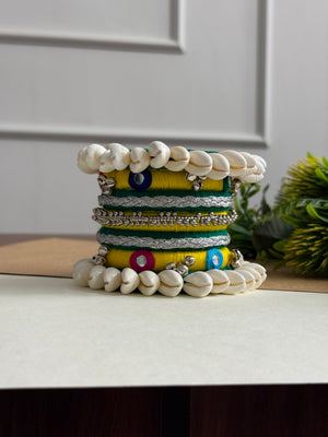 Green with Yellow Colour Bangels with Multicoloured Thred work with Silver Ghughri for a playful yet elegant festive look. Ideal for joyful Garba twirls and energetic Dandiya fun.