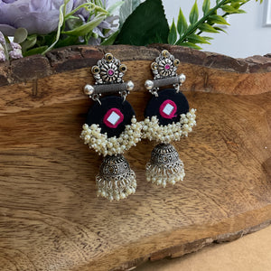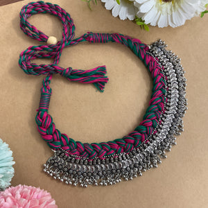 Masaba handmade cotton fabric necklace features Pink nd green thread with attched Oxidised Nackpiece And pair with Jumkha Earrings creating a sleek and modern look. Perfect for adding a touch of understated glamour to any outfit.