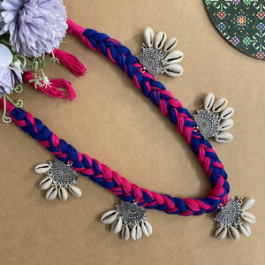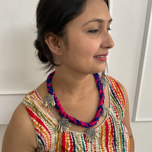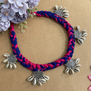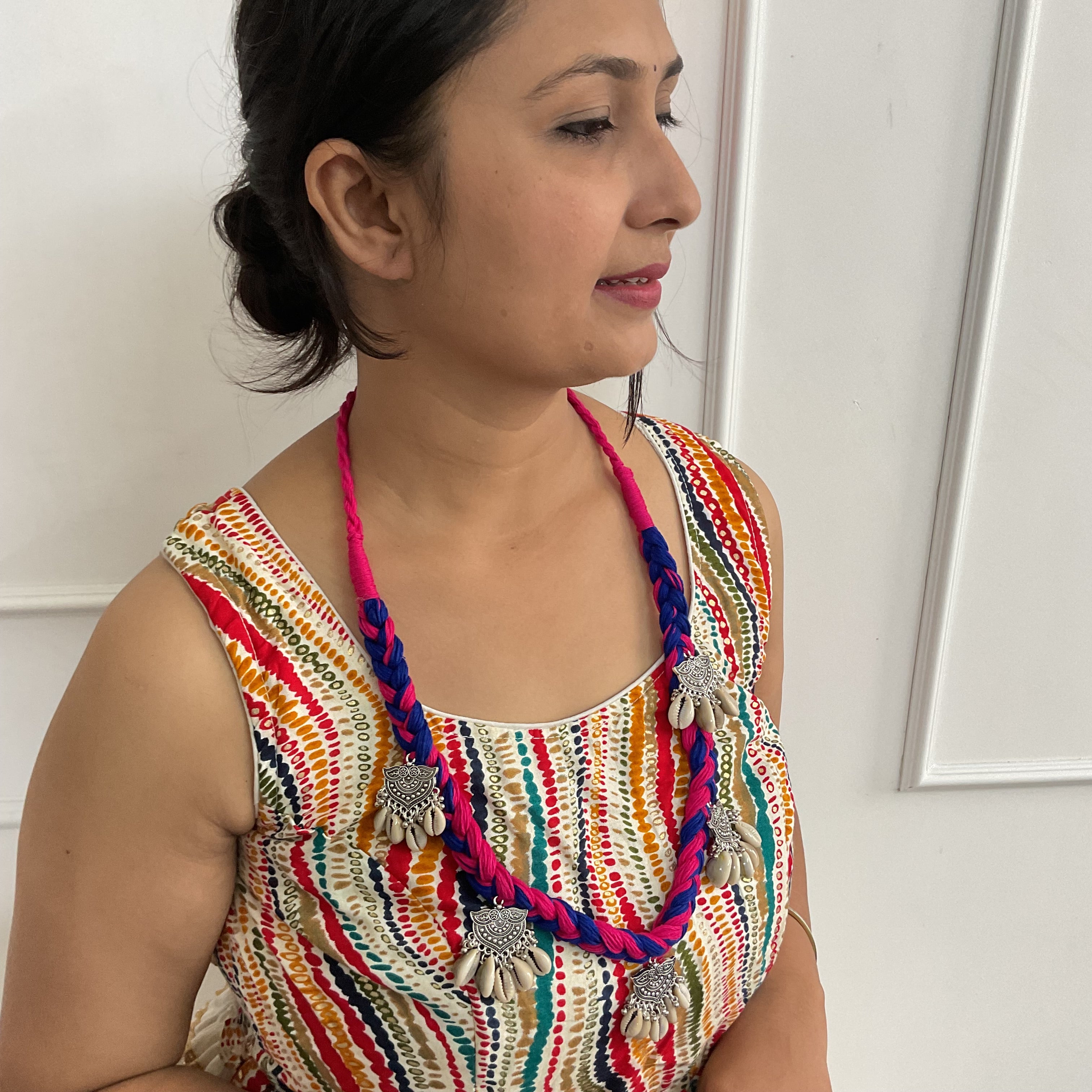 Nitara handmade cotton fabric necklace features Pink nd Blue thread with attched Oxidised Nackpiece creating a sleek and modern look. Perfect for adding a touch of understated glamour to any outfit.