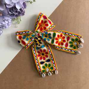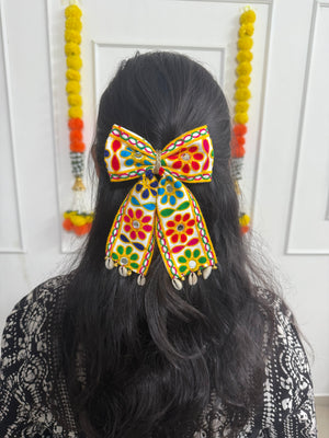 A Navratri bow is a decorative hair accessory for the Navratri festival, often a vibrant hair bow with intricate embroidery, mirrors, shells, and bells, designed to add a festive touch to traditional outfits for Garba and Dandiya dances. It can also refer to the bow and arrow weapon held by Goddess Durga, symbolizing her ability to control and direct energy, focus, and the mind to guide devotees toward righteousness.